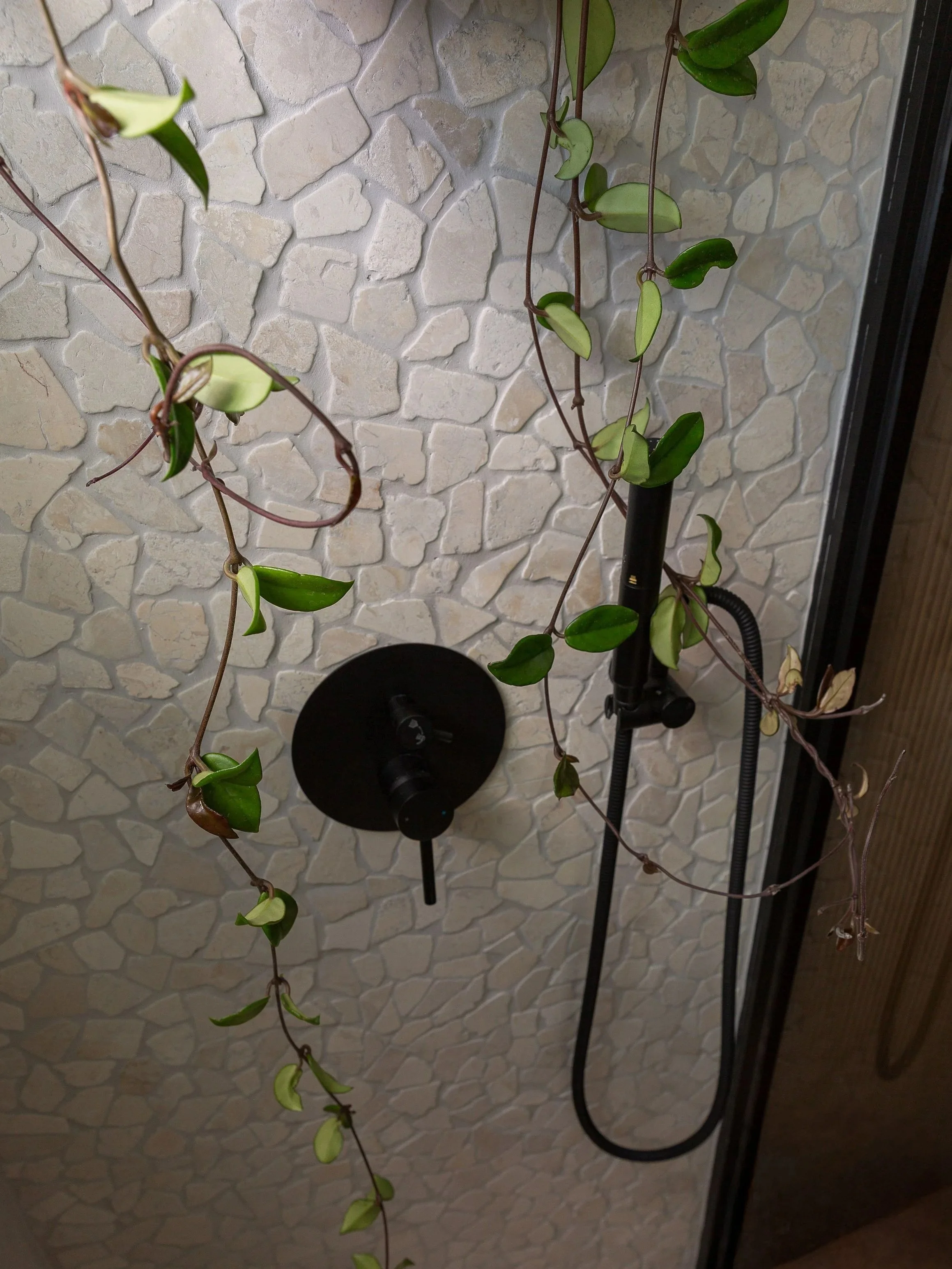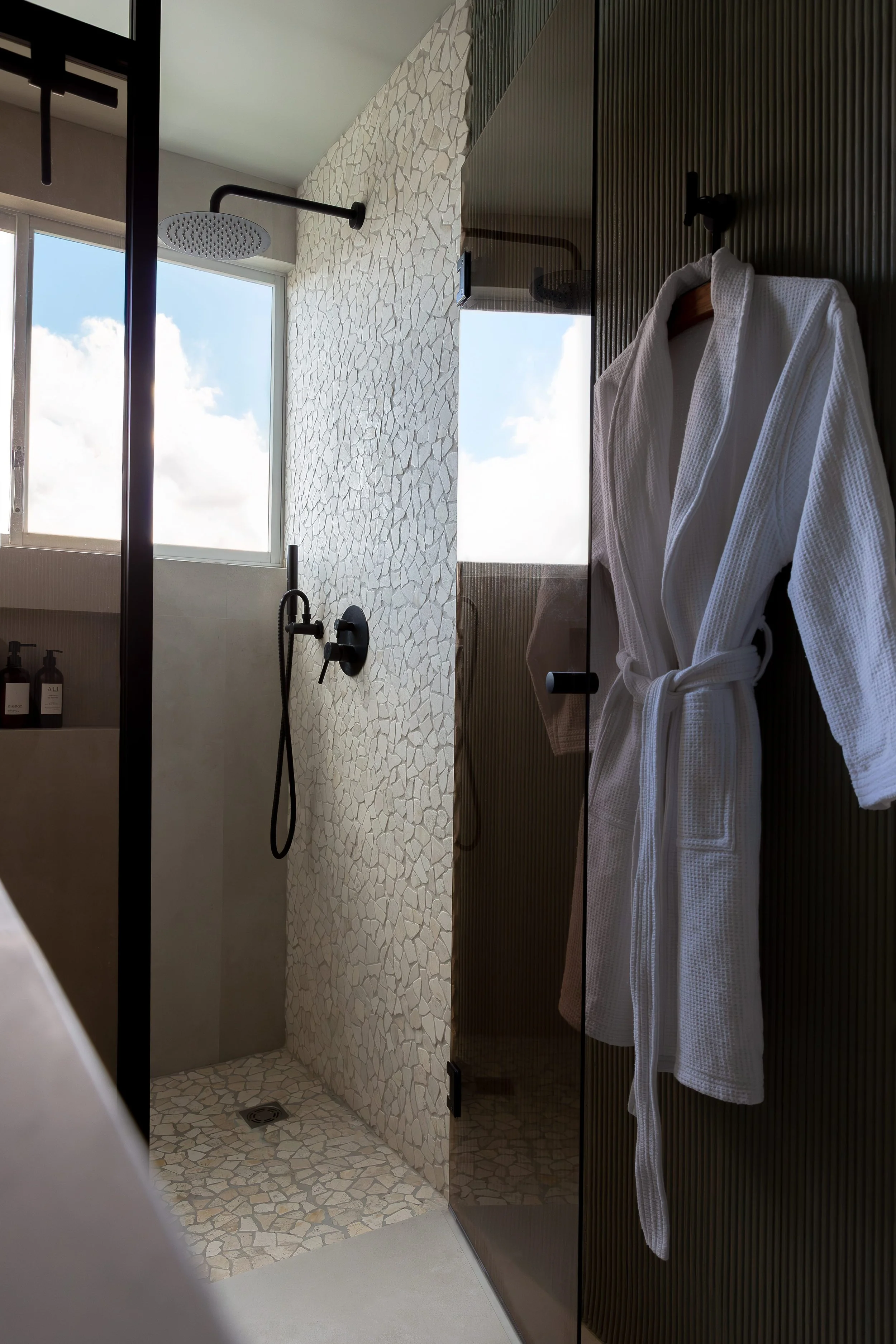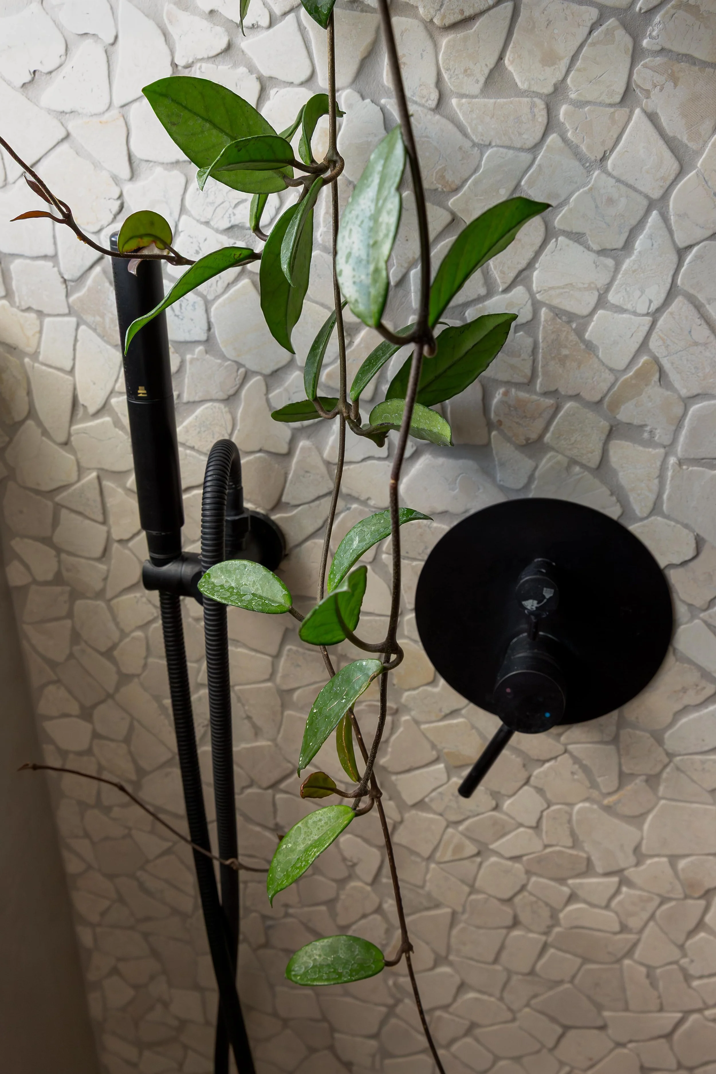 Though smaller in size, this bathroom was designed with the same attention to detail and artisanal care. Hand-textured walls bring a gentle rhythm, while the mosaic stone of the shower—set piece by piece by local hands—connects you back to nature’s raw beauty. A floating stone sink keeps the space open and minimal, complemented by matte black fixtures that add a sculptural edge.