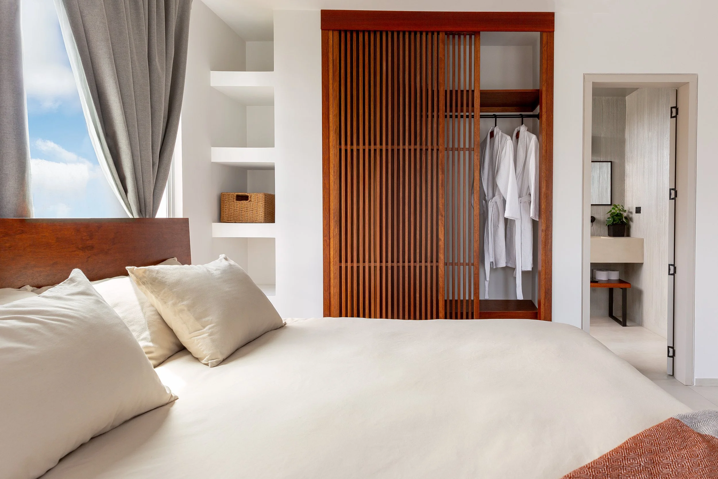 This king room was imagined as a place to exhale. Every piece you see was shaped by local artisans—the bed carved from warm wood with sculptural round legs, the closet doors lined with slatted rhythms of light and shadow, the side table curved like a piece of sculpture. Soft curtains filter the sky, while handwoven textiles add a whisper of color and craft.
