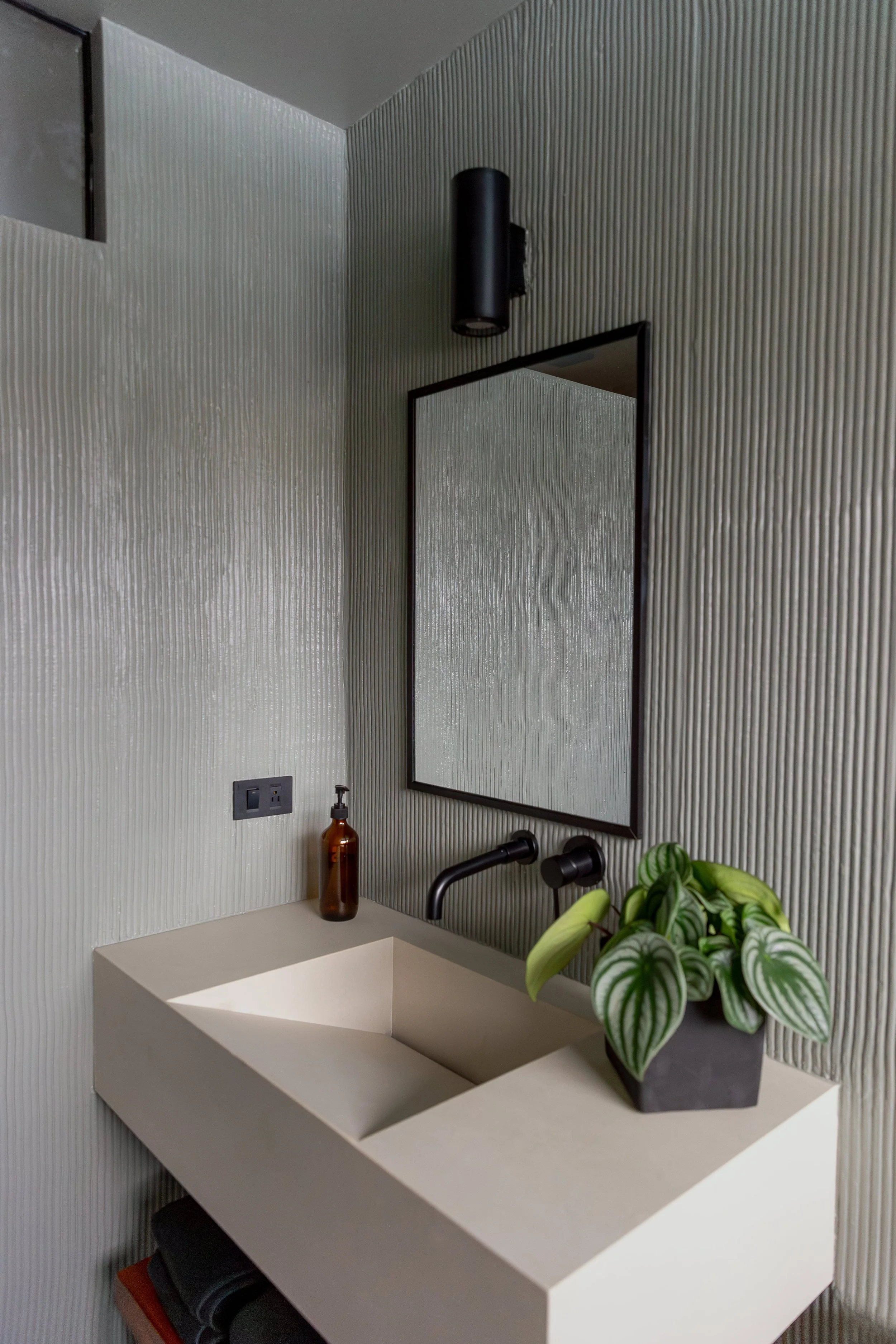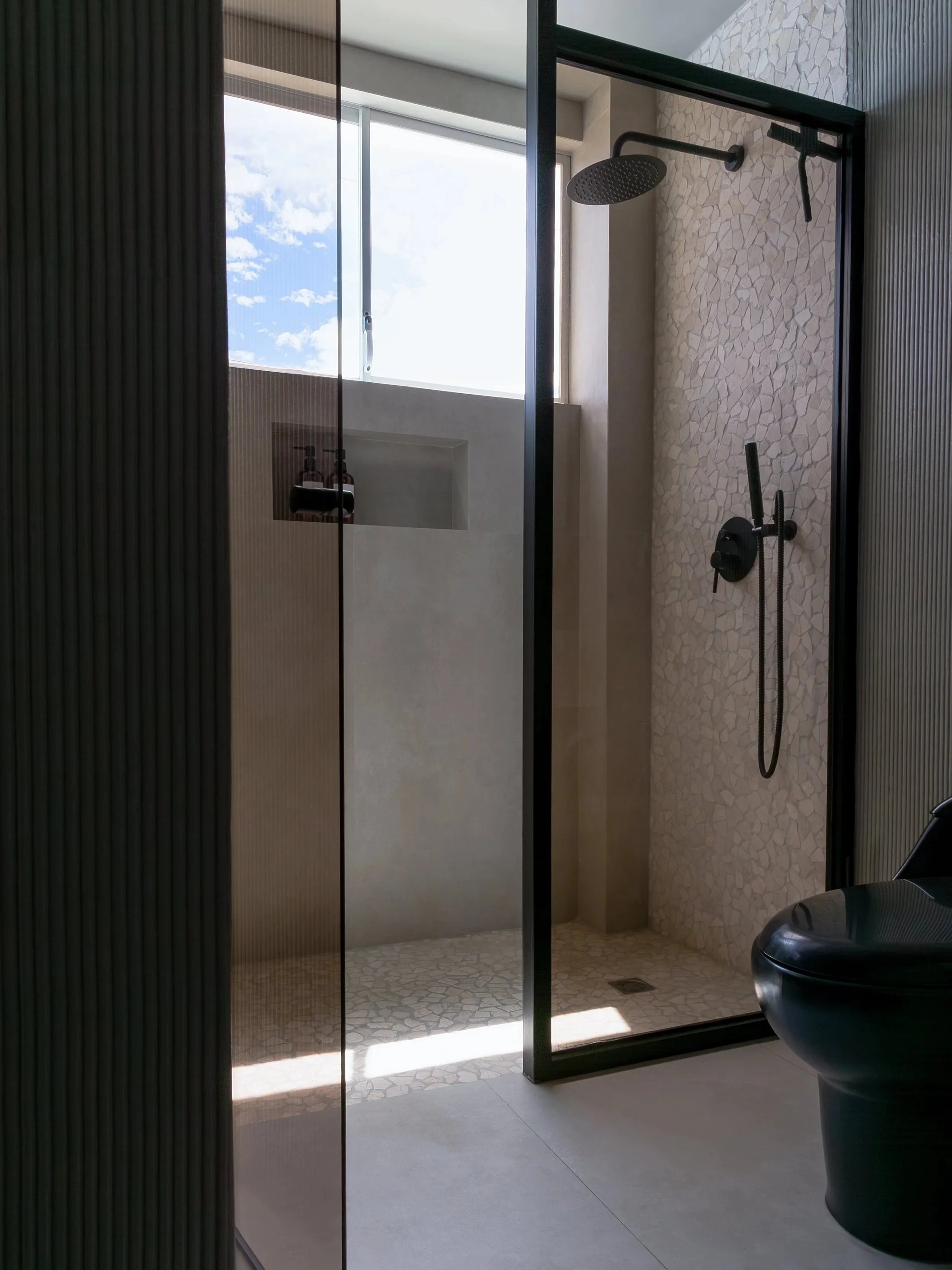 This bathroom is an ode to simplicity and craft. The walls, textured with hand-finished vertical lines, create a quiet rhythm that pairs with the mosaic stone of the shower—each piece carefully set by local hands. These stones bring you closer to nature, grounding each moment in the raw beauty of the earth. A floating stone sink anchors the room in minimalism, while matte black fixtures add a modern, sculptural contrast.
