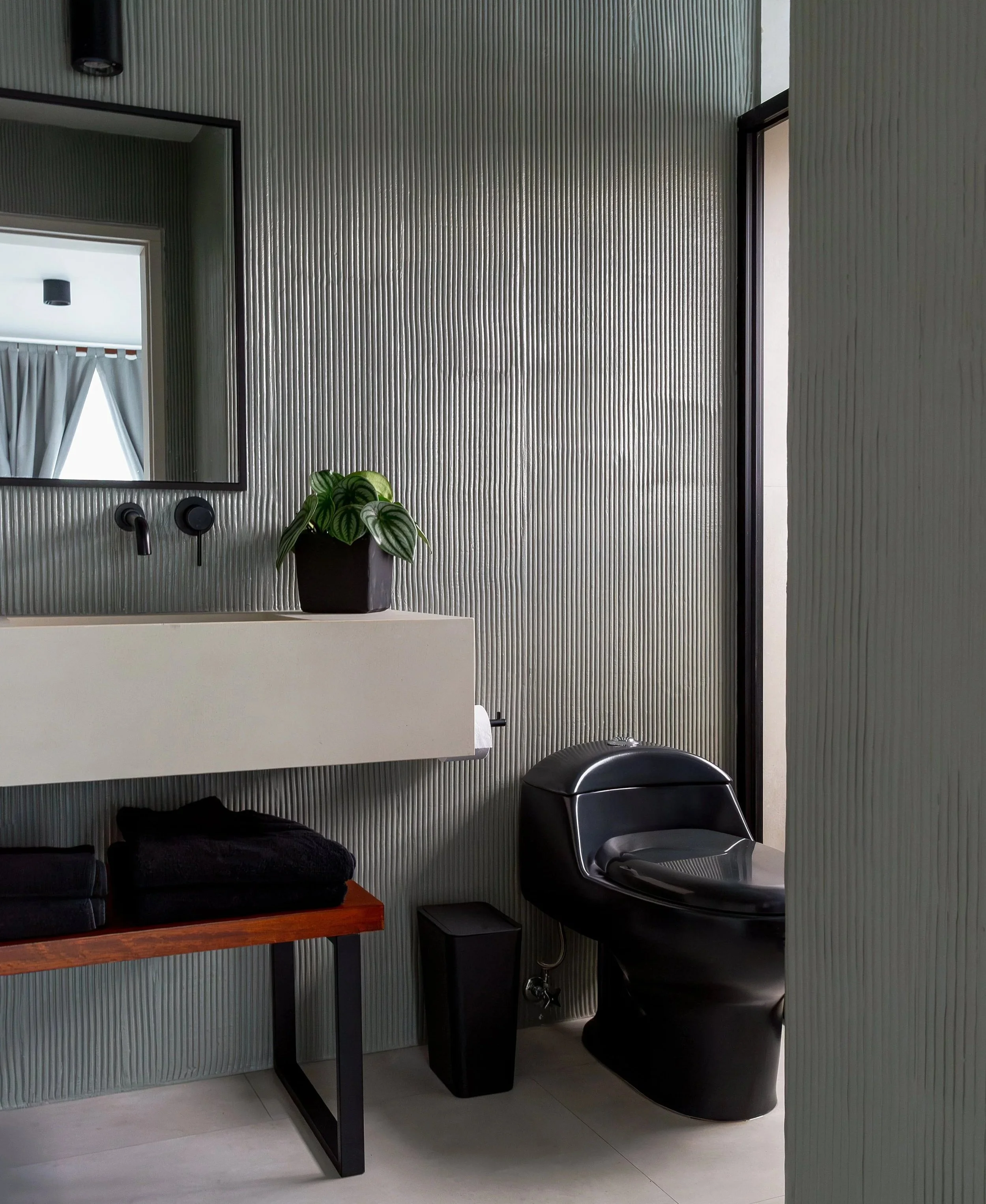 Even the smallest details—like the custom wood-and-steel bench, the deep black ceramic toilet, or the gentle green of a living plant—were chosen to bring harmony and intention. Here, function and artistry merge into a space that feels both grounding and elevated—a place where every ritual becomes an act of care.