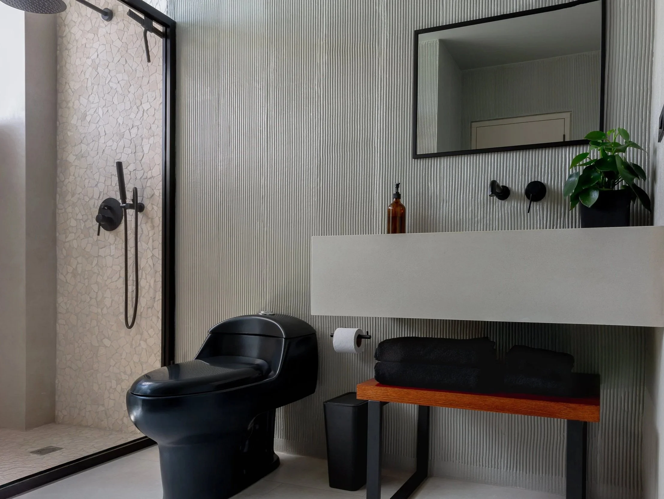 Every detail has intention: the custom wood accents, the deep black ceramic toilet, and the touch of greenery that softens the space. Here, simplicity doesn’t mean less—it means balance. A quiet corner where function and artistry meet, turning everyday rituals into moments of calm.