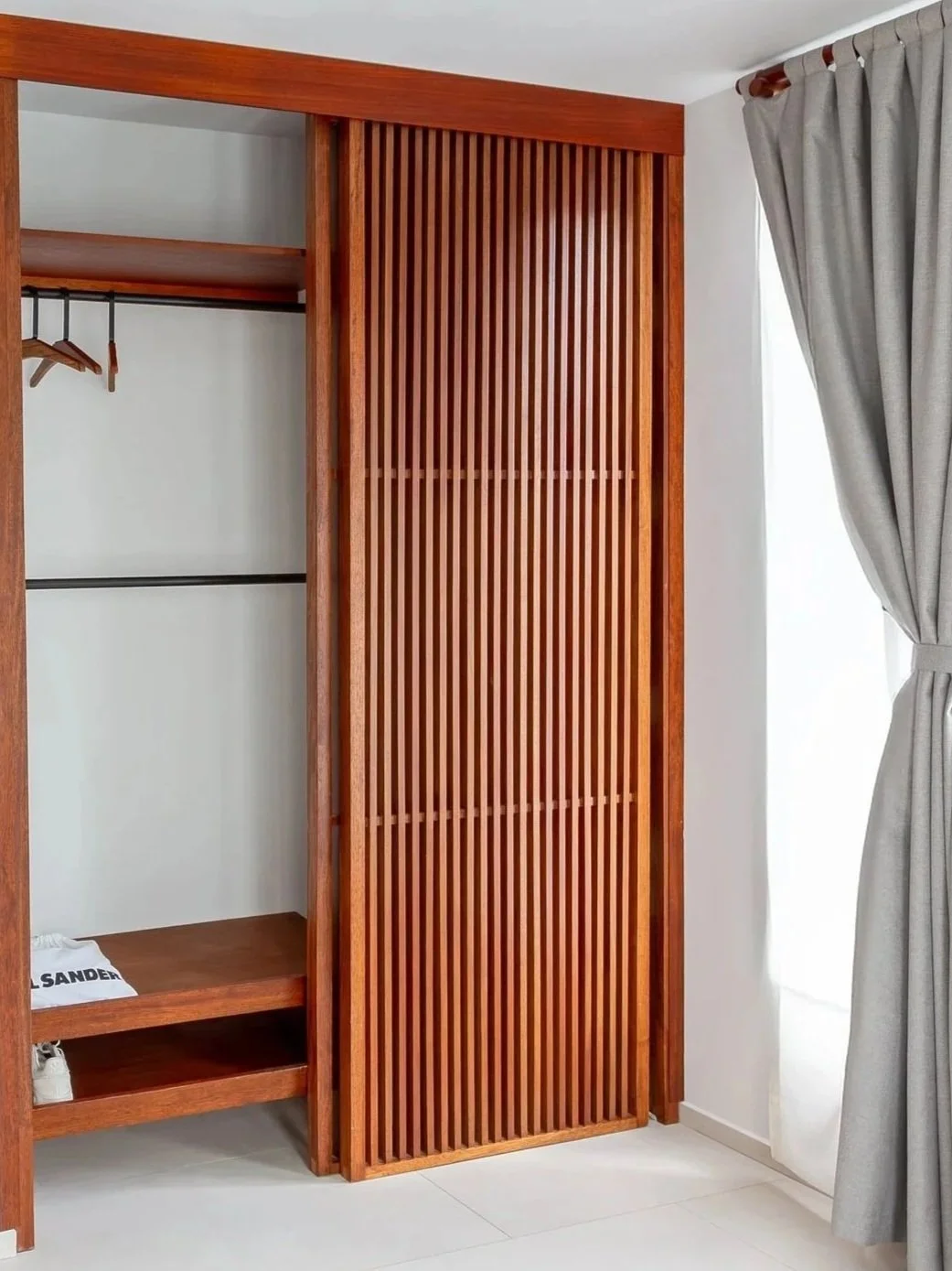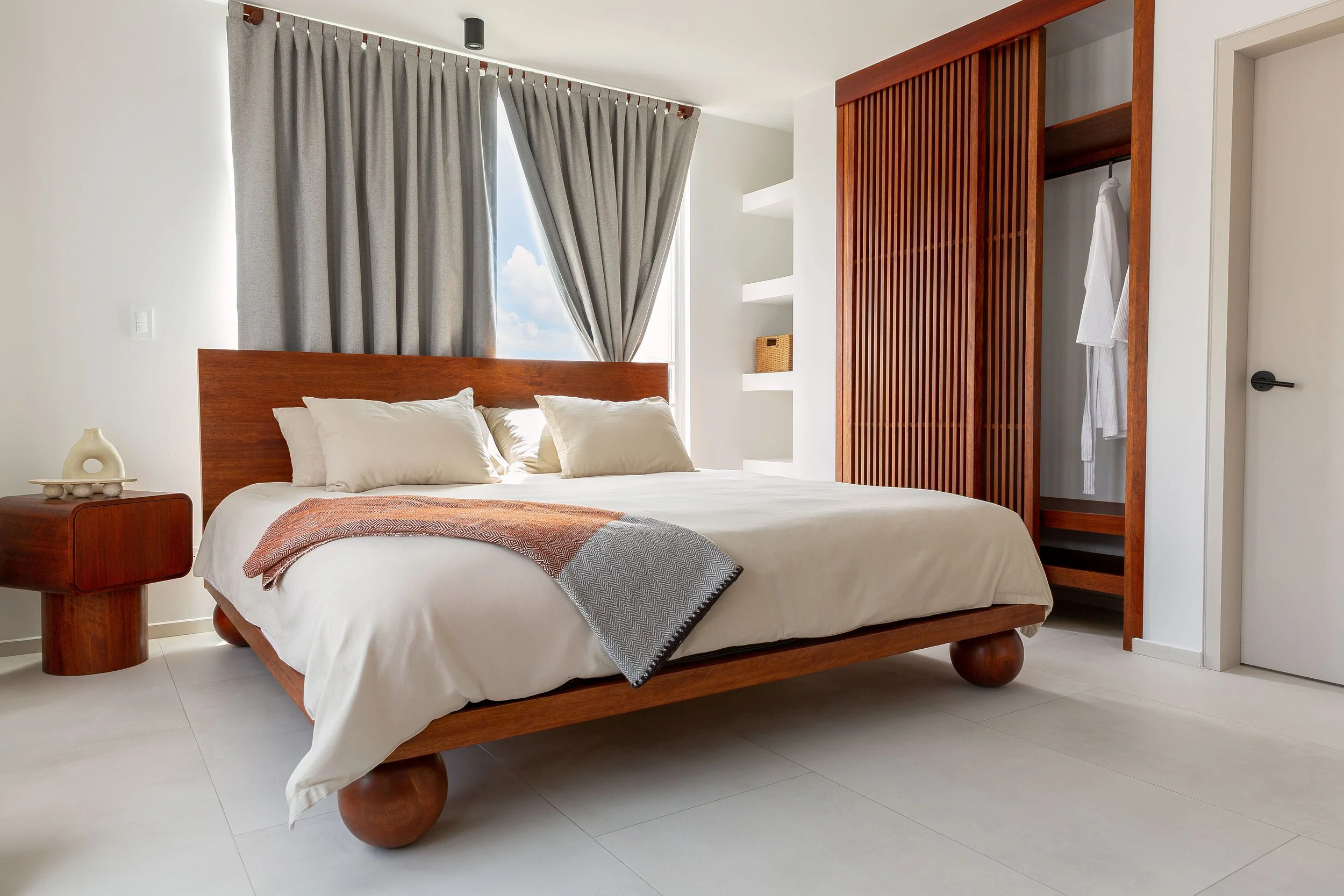 This queen bedroom was designed as a retreat from noise and distraction—a place to truly unwind. Flooded with natural sunlight and offering generous walking space, it feels open and airy while remaining warm and grounded. Every element has been crafted by local artisans: the bed carved from rich wood with sculptural round legs, the slatted closet doors that play with light and shadow, and the side table shaped with the grace of sculpture. Soft curtains frame the daylight, while handwoven textiles add subtle layers of color and craft.